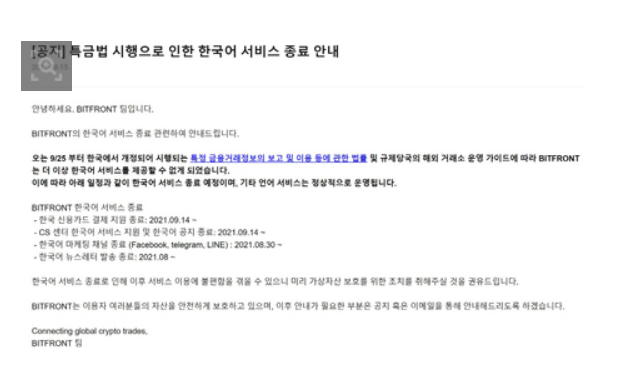 비트프론트의 한국어 서비스 종료도 역시 개정된 특금법에 따른 조치로 보고 있습니다. 비트프론트 측은 "다음 달 25일부터 한국에서 개정되어 시행하는 특금법 및 규제당국의 해외 거래소 운영 가이드에 따라 비트프론트는 더 이상 한국어 서비스를 제공할 수 없다"라고 설명했습니다.