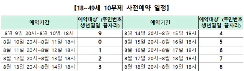예를 들어, 예약이 시작되는 9일 20시부터 10일 18시까지는 18~49세 연령층 중 주민등록번호 생년월일 끝자리가 9인 사람들이 예약할 수 있습니다.