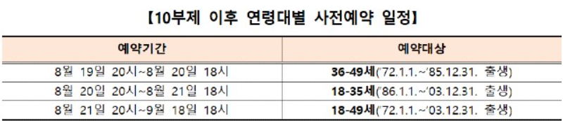 10부제 예약이 끝난 8월 19일 20시부터는 연령대별로 두 그룹으로 나누어 하루씩 예약이 가능하며, 그 이후는 연령에 관계없이 9월 18일 18시까지 언제든지 추가로 예약하거나, 예약 변경이 가능합니다.