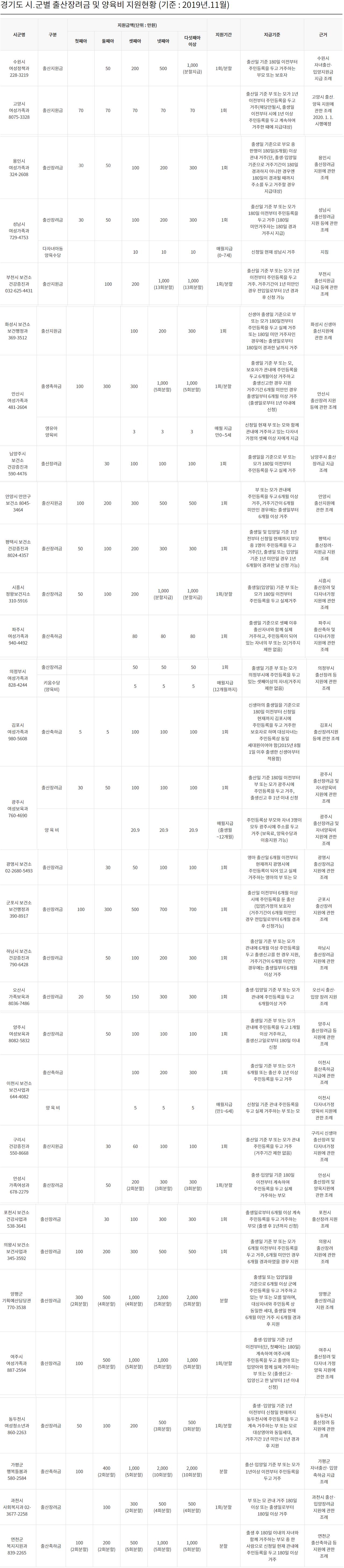 자녀수를 기준으로 첫째아 지급, 둘째아 이상 지급, 셋째아 이상 지급으로 분류됩니다. 하지만 경기도 양평군은 올해 신생아 양육비로 첫째 500만 원, 둘째 1200만 원, 셋째~다섯째 3000만 원, 여섯째 이상은 3500만 원까지 지원한다고 발표했습니다.
